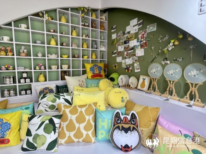 在呈貢萬溪沖社區(qū)的梨好郵局,琳瑯滿目的“寶珠梨”文創(chuàng)衍生品擺滿商店,梨抱枕、繪本、背包……可愛的寶珠梨形象,讓游客們愛不釋手。郵局墻面采用四個梨子抽象造型,形成函件墻、明信片錄制區(qū)、吧臺背景墻、時光留言墻,設(shè)置了文創(chuàng)展示售賣、郵戳集郵、吧臺服務、梨產(chǎn)品售賣、拍照打卡留念等功能區(qū)。
