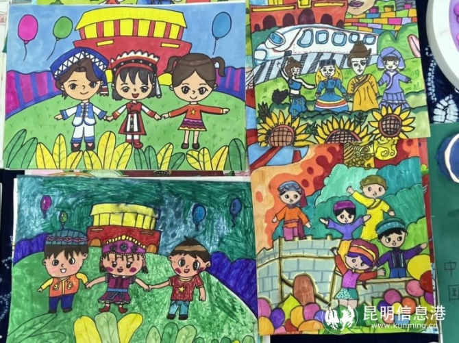 藍(lán)天白云下,五星紅旗前,不同少數(shù)民族的孩子牽手在天安門前跳舞;長(zhǎng)城上、高鐵旁,各民族的孩子們歡快玩?!环珍浽谧髌逢惲惺依锏睦L畫作品,描述了學(xué)生心目中“民族團(tuán)結(jié)一家親”的樣子,同時(shí)也是洱源縣寧湖第二小學(xué),通過多措并舉、創(chuàng)新載體,抓實(shí)民族團(tuán)結(jié)進(jìn)步教育工作的生動(dòng)縮影。