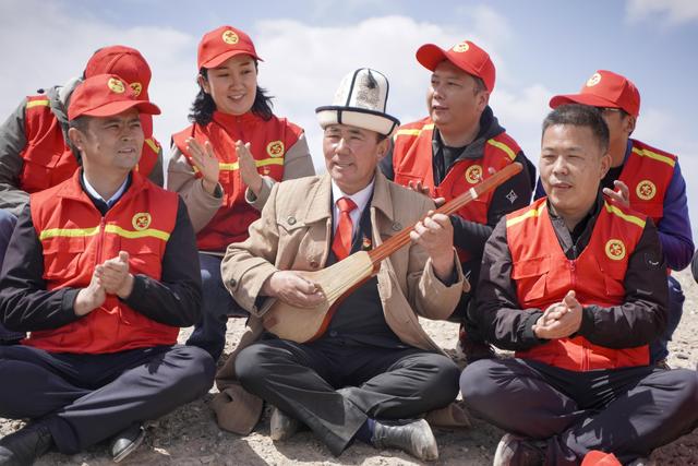 牧民阿布都加帕爾·猛德(中)和當(dāng)?shù)攸h員干部一道過主題黨日活動(2022年4月16日攝)。新華社發(fā)(艾買提江·艾則木 攝)