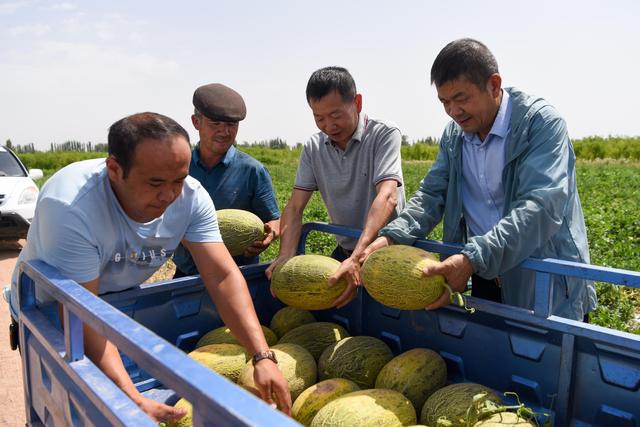在新疆喀什地區(qū)伽師縣臥里托格拉克鎮(zhèn),廣東援疆佛山駐伽師工作隊(duì)的干部幫助農(nóng)戶采收伽師瓜(2021年7月11日攝)。新華社記者 丁磊 攝
