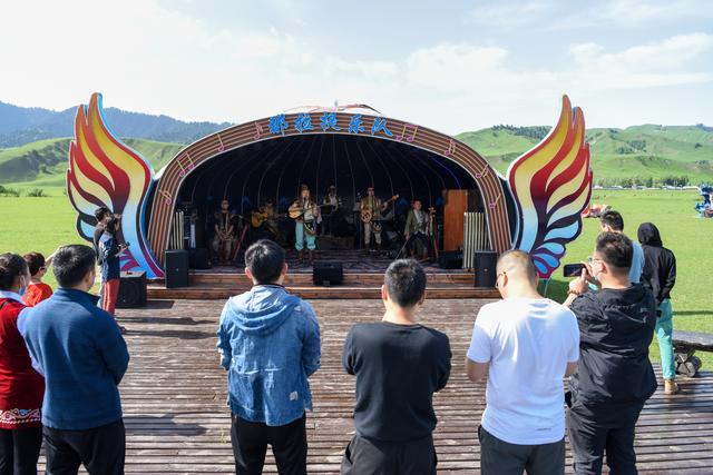 在新疆那拉提旅游風(fēng)景區(qū),由多民族成員組成的那拉提樂隊(duì)為游客演繹不同風(fēng)格的音樂(2021年6月3日攝)。新華社記者 丁磊 攝