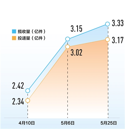 4月10日以來,各地各部門多措并舉保通保暢,全國停運的郵政快遞分撥中心和郵件快件積壓數(shù)均大幅下降。5月6日,全國郵件快件攬收、投遞量均恢復(fù)至3億件以上;5月28日,郵件快件攬收量約為3.14億件,投遞量約為3.22億件,均超過去年同期水平。