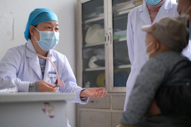 4月25日,青海省婦女兒童醫(yī)院醫(yī)生、青南支醫(yī)隊(duì)員孫敬(左一)在青海省玉樹藏族自治州人民醫(yī)院兒科門診坐診。(新華社記者韓方方/攝)
