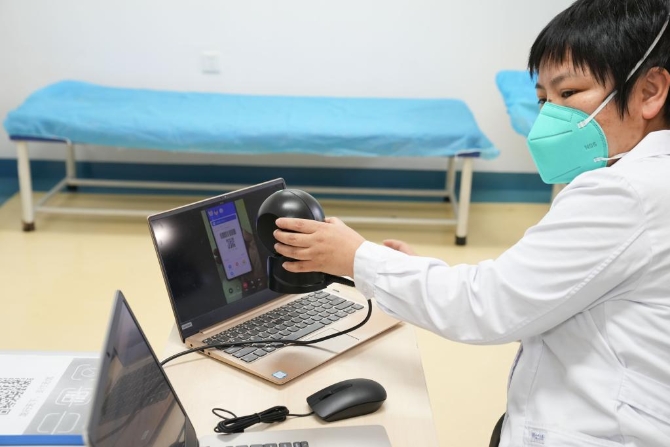 5月22日,在北京市豐臺區(qū)盧溝橋社區(qū)衛(wèi)生服務(wù)中心,醫(yī)務(wù)工作者通過視頻連線的方式為預(yù)約上門治療的患者掃描電子醫(yī)保卡。(新華社記者鞠煥宗/攝)
