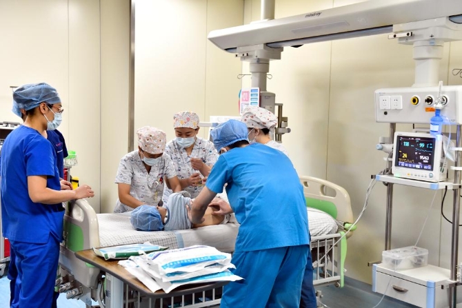 1月1日,在山東省棗莊市婦幼保健院兒童ICU病房,醫(yī)護(hù)人員準(zhǔn)備為4歲的脊髓性肌萎縮癥患兒注射靶向治療藥物諾西那生鈉。(新華社記者郭緒雷/攝)
