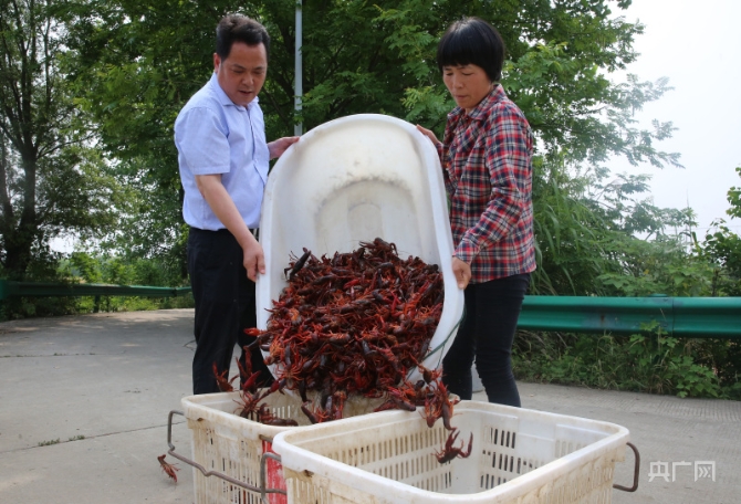 銅陵市義安區(qū)東聯(lián)鎮(zhèn)東埂村黨總支書記何海龍幫助農(nóng)戶一起將小龍蝦裝箱稱重(央廣網(wǎng)發(fā) 梅建廣攝)