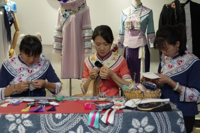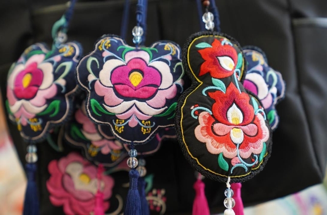 每逢端午節(jié),牟定縣的男女老少都會(huì)在胸前佩戴精美的香囊。
