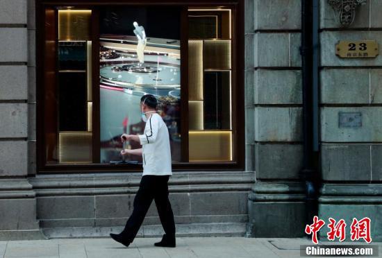 工人在擦拭櫥窗為開門營業(yè)做準備。