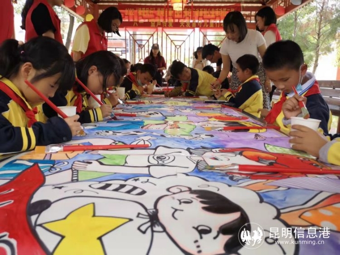放下書信,孩子們又在老師的指導(dǎo)下,共同繪制了“童心獻(xiàn)禮二十大”主題畫卷。畫卷上,嵩明文化IP“網(wǎng)紅”蘭茂和小明,冰墩墩、雪融融等卡通形象躍然紙上,惟妙惟肖。孩子們拿出畫筆,將畫卷涂上自己喜歡的顏色,用這種方式展示出自己眼中世界。