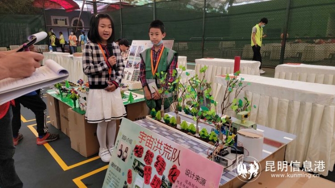頒獎儀式上,文林小學(xué)的張欽堯、師大附小的佘昕芮這兩位四年級的選手聯(lián)合設(shè)計的“智能綠化管理系統(tǒng)”獲得了智能物聯(lián)網(wǎng)主題賽(小學(xué)組)第一名?!按蠹铱梢钥吹?,這套模型配備了RFID射頻識別、紅外遙控、土壤濕度檢測傳感器等裝置,可實時監(jiān)控植物的生長情況,智能綠化機器人還能及時進行澆灌、修剪等綠植管養(yǎng),為人類分擔(dān)部分工作?!睆垰J堯告訴記者,他和搭檔發(fā)現(xiàn)昆明道路綠化范圍非常廣,但工作人員的管理和養(yǎng)護工作復(fù)雜又辛苦,為了提高其工作效率和綠植存活率,他們擬定大綱、選定題目、走訪調(diào)研,并利用課余時間制作模型,歷時三個月完成了作品。