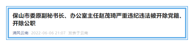 記者從清風(fēng)云南獲悉,保山市委原副秘書長、辦公室主任趙茂琦嚴(yán)重違紀(jì)違法被開除黨籍、開除公職。詳情如下: