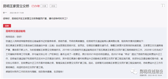 近日,有網(wǎng)友通過地方領導留言板咨詢昆明經(jīng)開區(qū)王家營立交橋改擴建何時開工?對此,昆明市交通運輸局進行了回復。