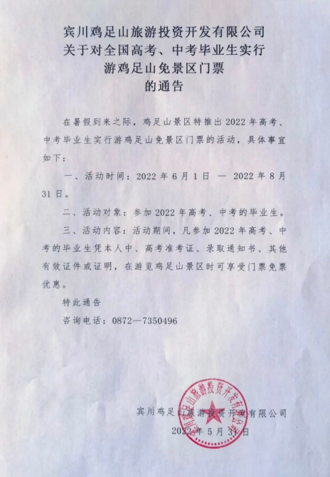 6月7日,賓川雞足山AAAA級景區(qū)微信公眾號發(fā)布通告,在暑假到來之際,雞足山景區(qū)特推出2022年高考、中考畢業(yè)生實行游雞足山免景區(qū)門票的活動,具體事宜如下: