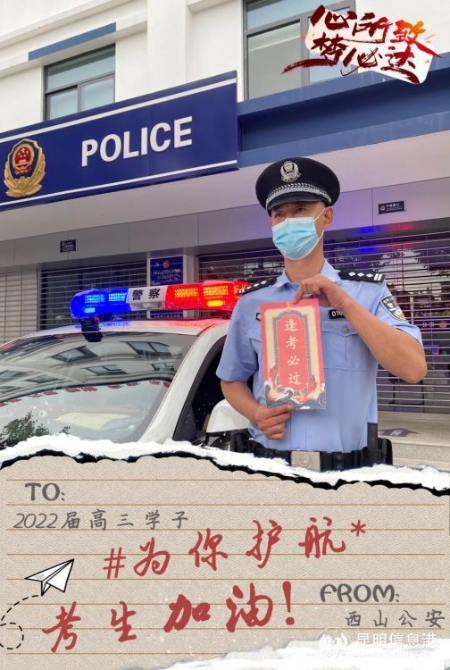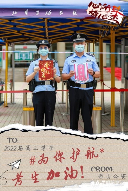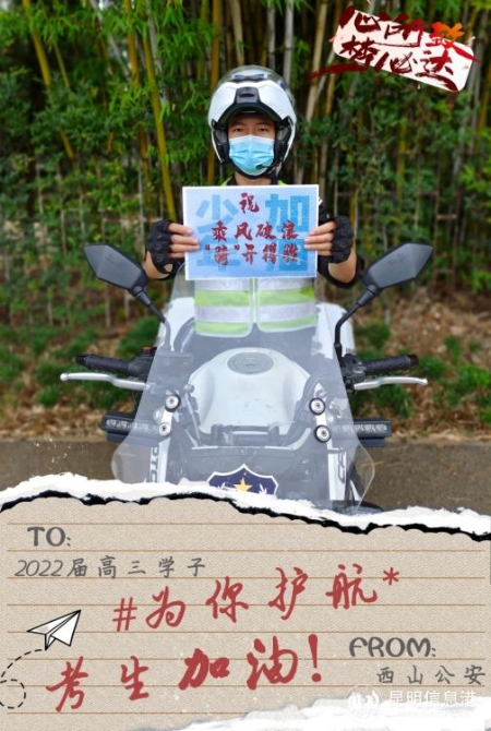 藏藍“護考團”送上真摯祝?!角饺f水,你將光芒萬丈!祝福所有考生用漂亮的答卷入場盛夏的遠方。加油?。。。ɡッ餍畔⒏?記者合宇聰 西山警方供圖)