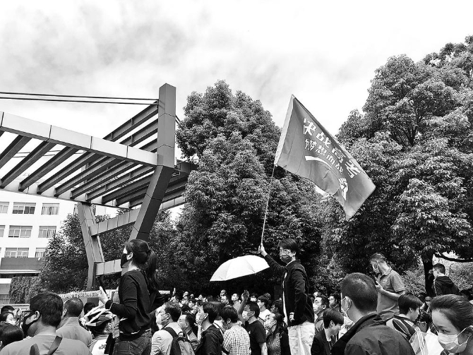 云南師大附中高新校區(qū)考點(diǎn)外,家長揮旗為考生鼓勁。