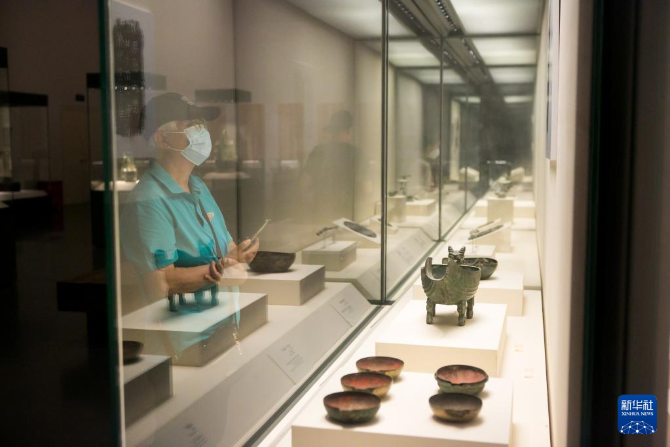 6月7日,觀眾在中國國家博物館觀看“齊侯子行”青銅匜。新華社記者 李京 攝