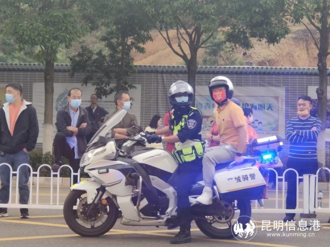 上午8時33分,師大附中一名老師向騎警求助稱,該校在昆三中考試的考生忘帶考試用品,急需趕往昆三中送給該考生。騎警7分鐘及時將該老師送達昆三中考點。