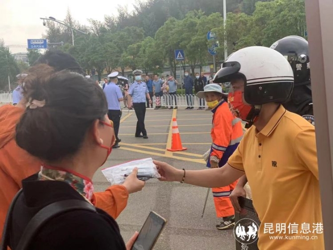 上午8時,昆三中的老師向考場外民警求助,稱一名該校在師大附中考點的考生身份證、準考證忘拿了,民警騎摩托一路狂奔,于8時08分,將身份證、準考證送到該考生手中。
