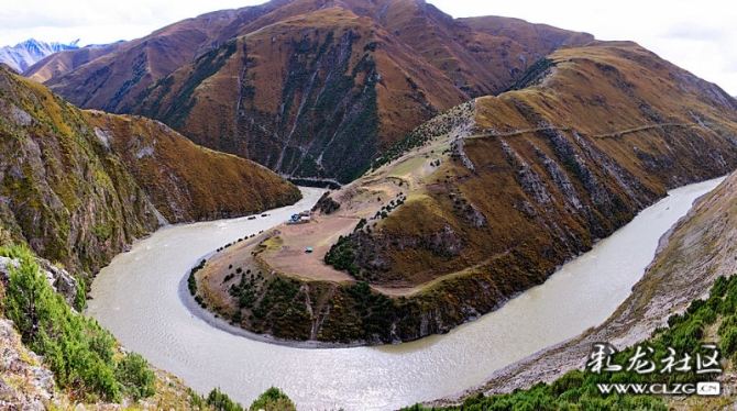 這里的形成是因為怒江流經(jīng)此處被絕壁阻隔,江水流向自原來的北南流向改為東西流向,流出300多米后,又被丹拉大山隔斷,再次掉頭由西向東急轉(zhuǎn),于是形成了此處半圓形大灣。夕陽西下,陽光打在此處的山上,加上藍綠色的江水,顏色美麗,景色壯闊。