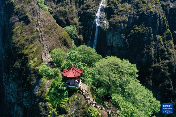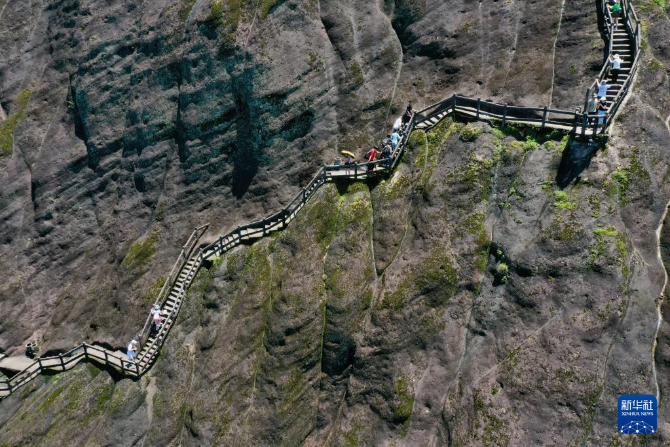 游客在武夷山景區(qū)攀登天游峰(6月6日攝,無人機照片)。新華社記者 姜克紅 攝