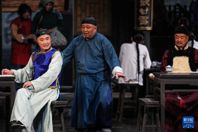 6月9日,演員梁冠華(中)、楊立新(左)、濮存昕(右)在臺上表演。新華社記者 彭子洋 攝