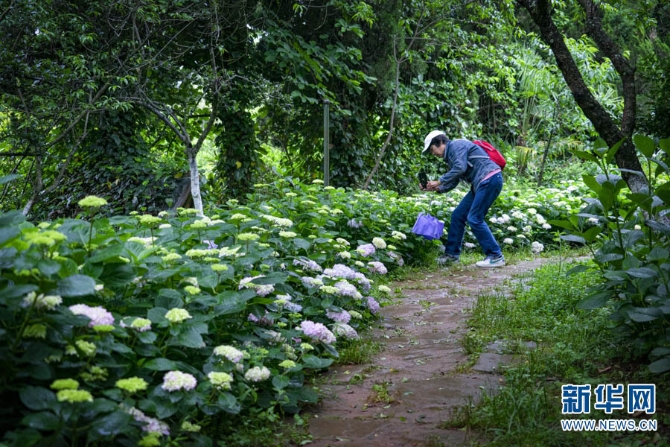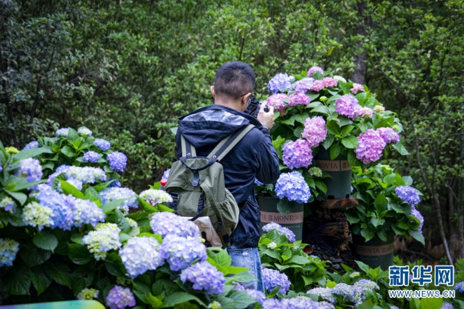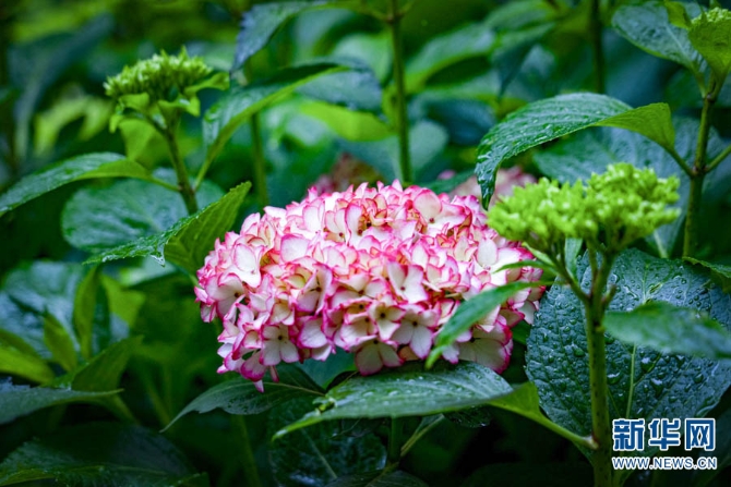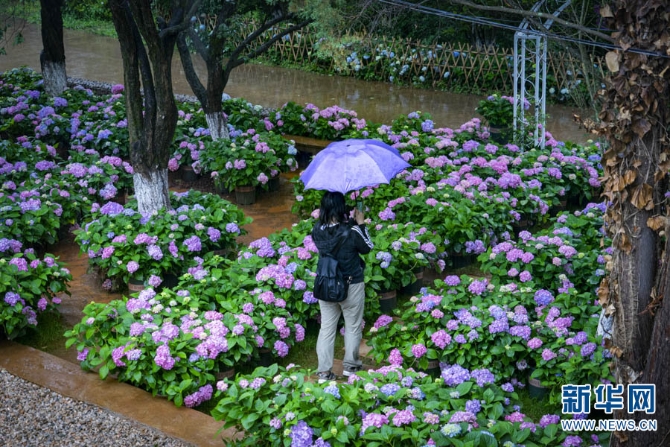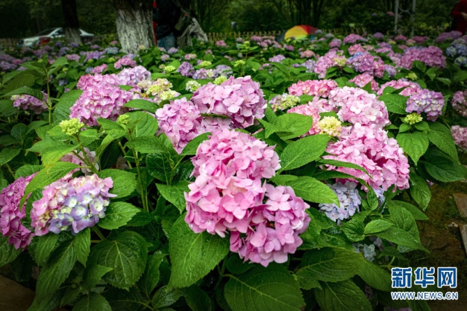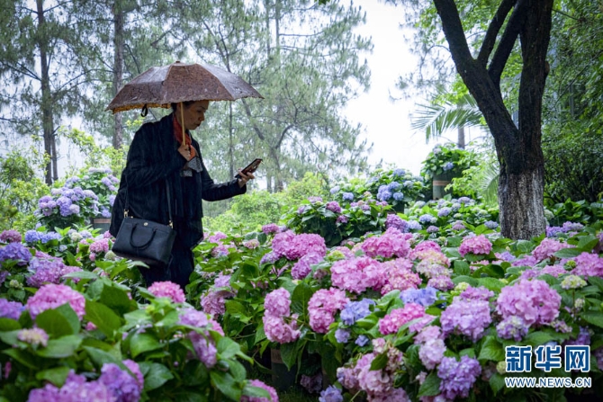 近日,云南昆明郊野公園成了繡球花的主場(chǎng),吸引了部分游客冒雨前來(lái)拍照打卡。新華網(wǎng)發(fā)(鄭益5月21日攝)