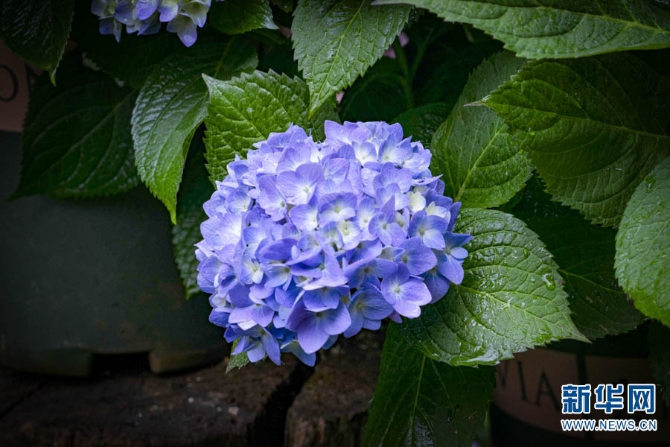 在雨中盛開的繡球花