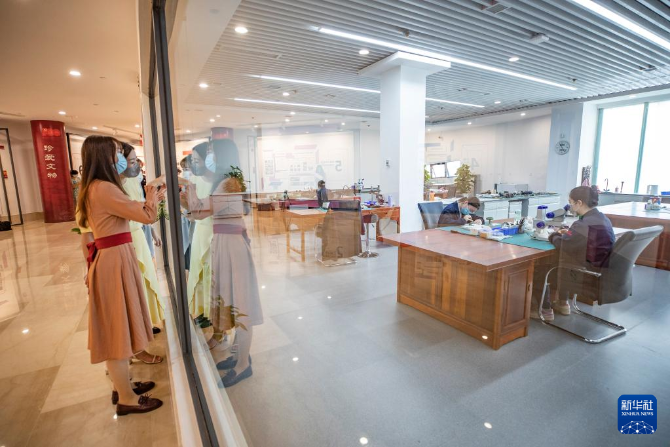 6月9日,在三峽文物科技保護(hù)基地,觀眾在半開(kāi)放式的文物修復(fù)室外觀看文物修復(fù)過(guò)程。新華社記者 黃偉 攝