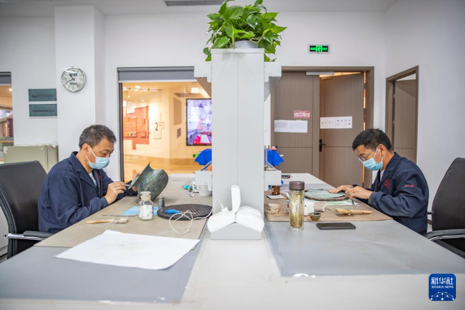 6月9日,在三峽文物科技保護(hù)基地,“文物醫(yī)生”在半開(kāi)放式的文物修復(fù)室內(nèi)修復(fù)青銅器。新華社記者 黃偉 攝
