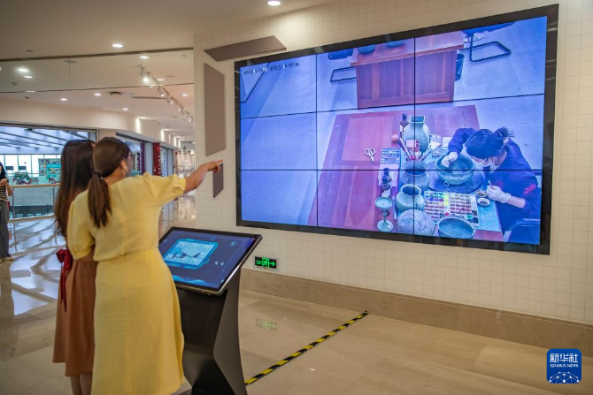 6月9日,在三峽文物科技保護(hù)基地,觀眾通過(guò)360°高清攝像頭觀看文物修復(fù)過(guò)程。新華社記者 黃偉 攝