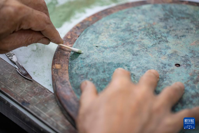 6月9日,在三峽文物科技保護(hù)基地,“文物醫(yī)生”在半開(kāi)放式的文物修復(fù)室內(nèi)對(duì)青銅器進(jìn)行清洗。新華社記者 黃偉 攝