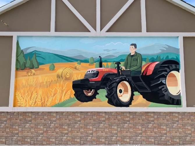 在西口村黨群服務(wù)中心,幾十面墻壁滿是各色墻繪,艷麗而靈動(dòng),灰頭土臉的老房子一下“活”了起來。這些作品都是近幾年創(chuàng)作的。尤其在2021年,西口村舉行了第一屆阿爾山市鄉(xiāng)村墻繪藝術(shù)大賽,上海大學(xué)上海美術(shù)學(xué)院、浙江藝術(shù)職業(yè)學(xué)院、廣州美術(shù)學(xué)院附中等8所院校,近千人次來到西口村,長(zhǎng)達(dá)數(shù)月進(jìn)行墻繪創(chuàng)作,總創(chuàng)作面積超1000平方米。