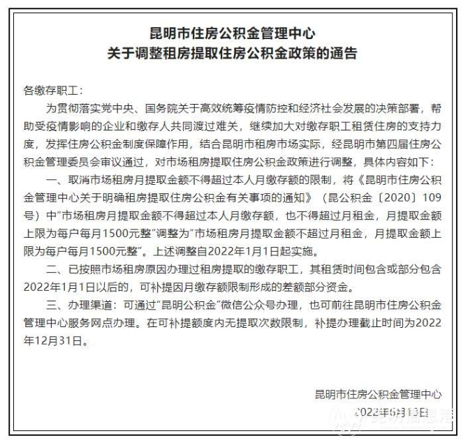 昆明信息港訊 記者黃彩英 6月13日,昆明市住房公積金管理中心發(fā)布“關(guān)于調(diào)整租房提取住房公積金政策的通告”,取消了公積金租房提取不可超過(guò)月繳存額的規(guī)定。同時(shí),已按照市場(chǎng)租房原因辦理過(guò)租房提取的繳存職工,其租賃時(shí)間包含或部分包含2022年1月1日以后的,可補(bǔ)提因月繳存額限制形成的差額部分資金。