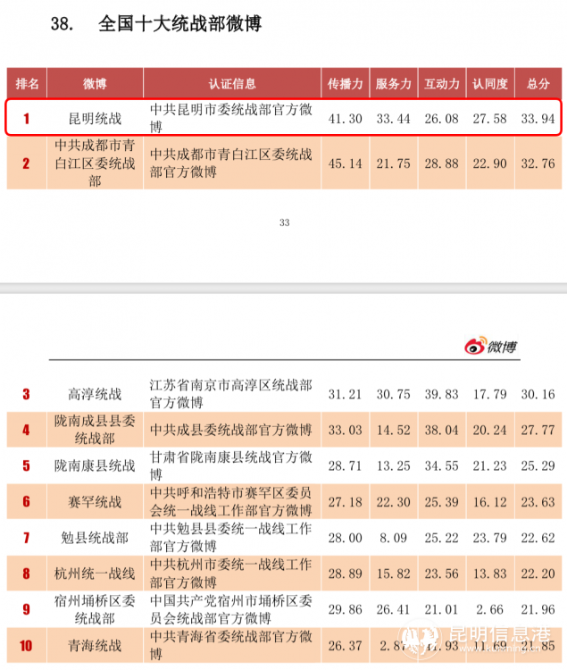 昆明信息港訊 記者周璐 日前,2022年第一季度政務(wù)微博影響力報(bào)告發(fā)布,昆明統(tǒng)戰(zhàn)微博上榜“全國(guó)十大統(tǒng)戰(zhàn)部微博”并位列榜首。