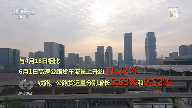 與4月18日相比,6月1日高速公路貨車流量上升約11.22%;鐵路、公路貨運(yùn)量分別增長5.63%和9.52%,均基本恢復(fù)至正常水平。全國郵政快遞日均業(yè)務(wù)量已基本恢復(fù)至去年同期水平。