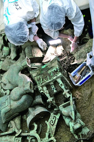 “目前已經(jīng)清理青銅器77件,玉石器120件,金器44件,象牙678根(段),象牙雕刻殘件46件?!彼拇ㄊ∥奈锟脊叛芯吭嚎偣こ處熤x振斌說(shuō),隨著考古現(xiàn)場(chǎng)發(fā)掘的進(jìn)行,出土文物的清理和保護(hù)、研究等工作也在推進(jìn)。
