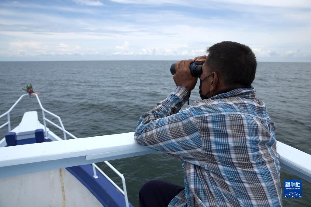 5月11日,一名泰國(guó)海洋與海岸資源局工作人員在泰國(guó)灣搜尋布氏鯨。新華社 記者王騰/攝