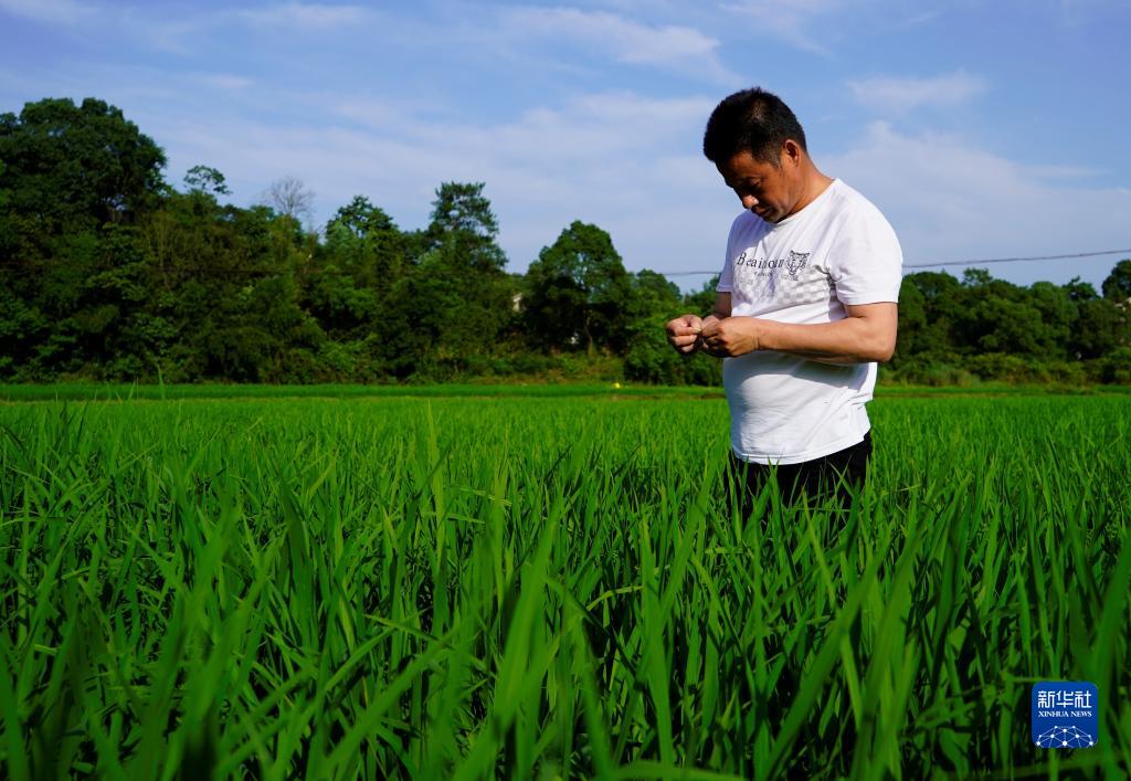 在湖南省醴陵市沈潭鎮(zhèn)沈潭社區(qū),種糧大戶朱建輝在查看水稻長勢(6月14日攝)。新華社記者 余春生 攝