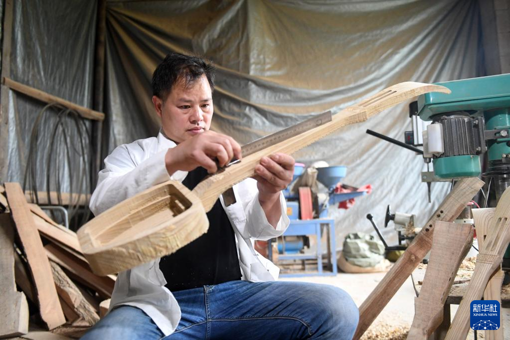 6月15日,在廣西三江侗族自治縣林溪鎮(zhèn)冠洞村,楊龔在工作間內(nèi)制作侗族琵琶。