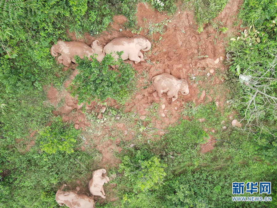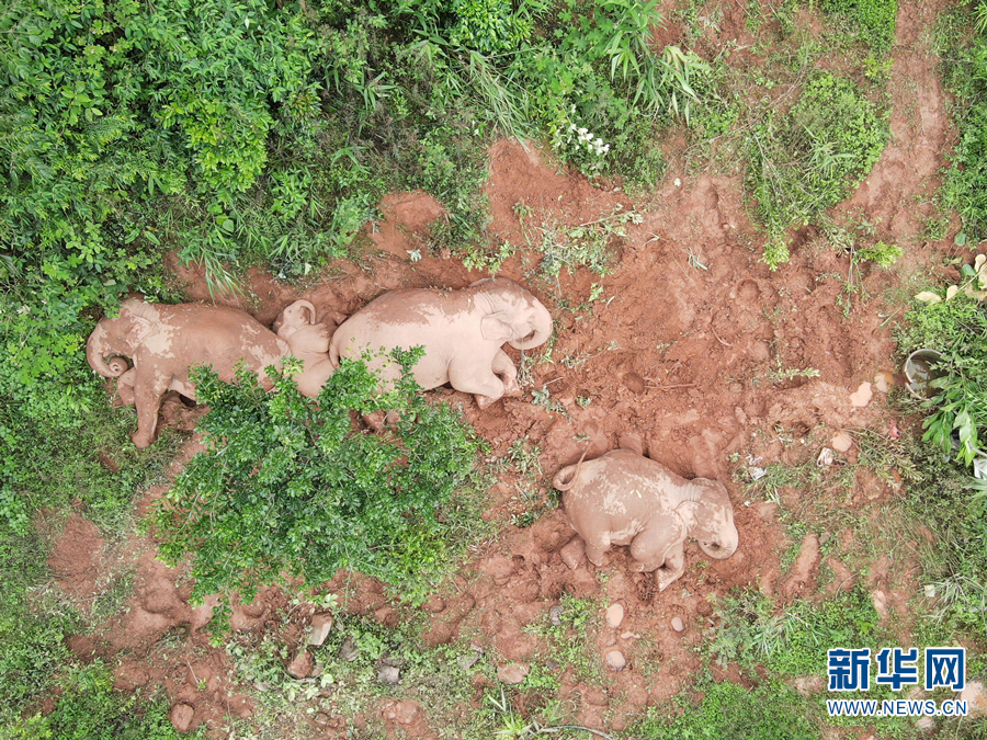 無人機(jī)拍攝到象群“午睡”(6月16日攝)。新華網(wǎng) 王思崎/攝