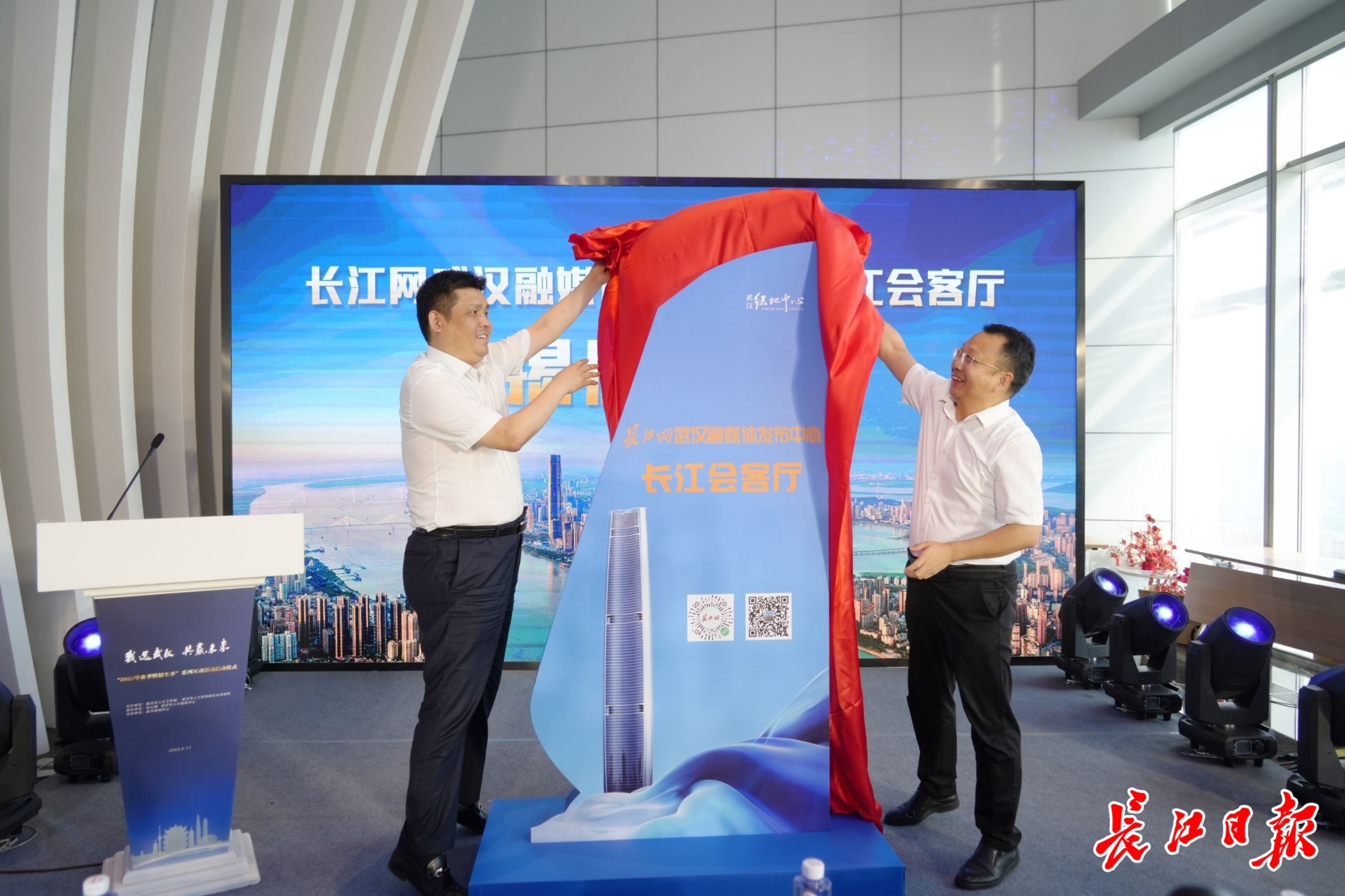 6月17日舉行的“我選武漢 共贏未來”2022畢業(yè)季暨招生季系列互動活動啟動儀式上,由全國重點新聞網(wǎng)長江網(wǎng)與世界500強企業(yè)綠地控股集團華中事業(yè)部聯(lián)合打造的“長江網(wǎng)武漢融媒體發(fā)布中心暨長江會客廳”揭牌。