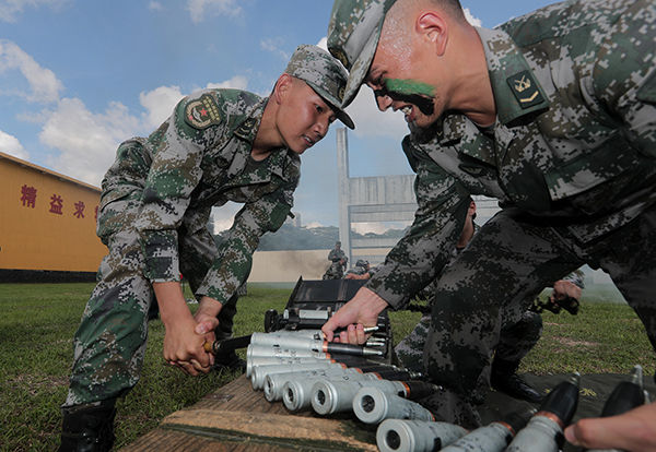 ↑駐香港部隊(duì)某旅裝步一連官兵裝填彈鏈(5月28日攝)。新華社發(fā)(易定 攝)