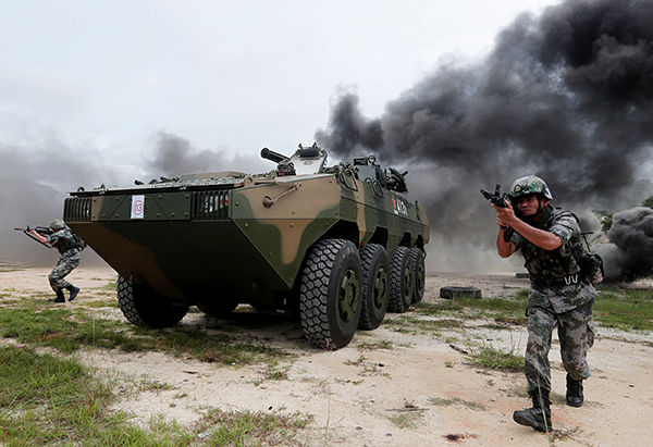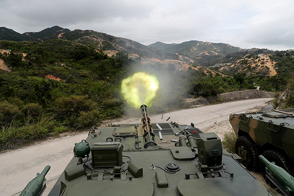 ↑駐香港部隊(duì)某旅裝步一連組織人車協(xié)同訓(xùn)練(5月24日攝)。新華社發(fā)(易定 攝)