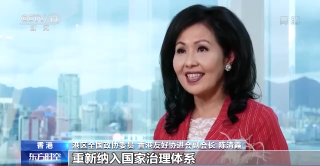 港區(qū)全國政協(xié)委員 香港友好協(xié)進會副會長 陳清霞:香港從回歸之日起,重新納入國家治理體系 ,走過25年不尋常的歷程?!耙粐鴥芍啤痹谙愀鄣膶嵺`,取得舉世公認的成功。