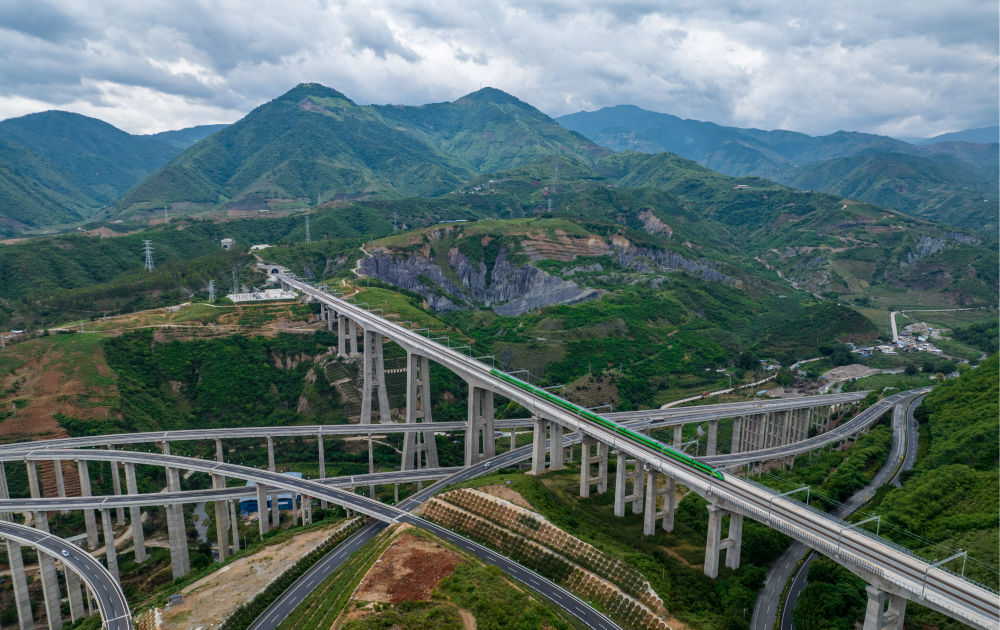 復(fù)興號列車通過中老鐵路南溪河特大橋(無人機照片,6月2日攝)。新華社記者 江文耀 攝
