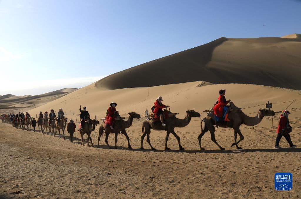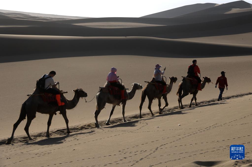 6月19日,游客在甘肅省敦煌市鳴沙山月牙泉景區(qū)騎駱駝游覽。