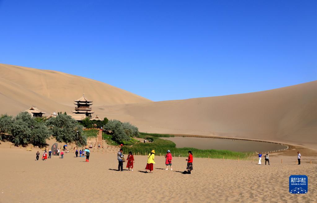 6月19日,游客在甘肅省敦煌市鳴沙山月牙泉景區(qū)游覽。