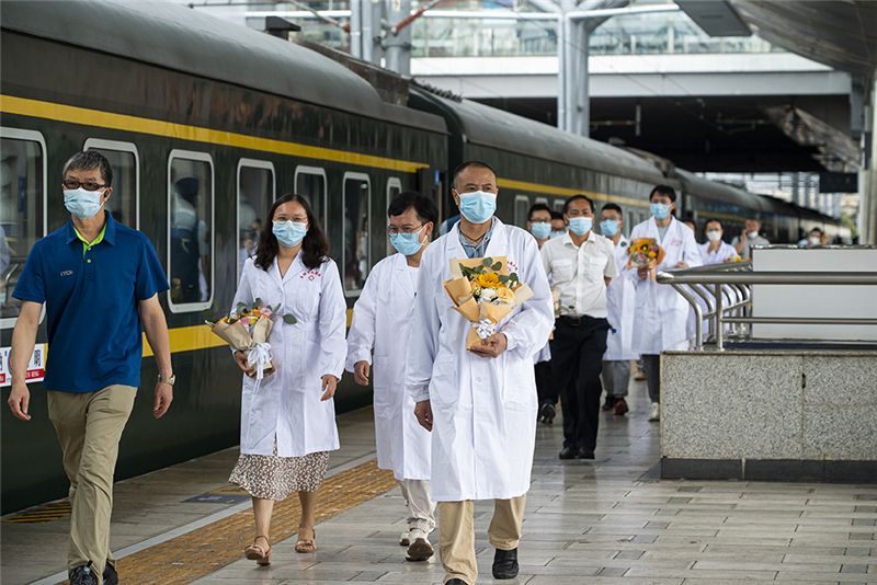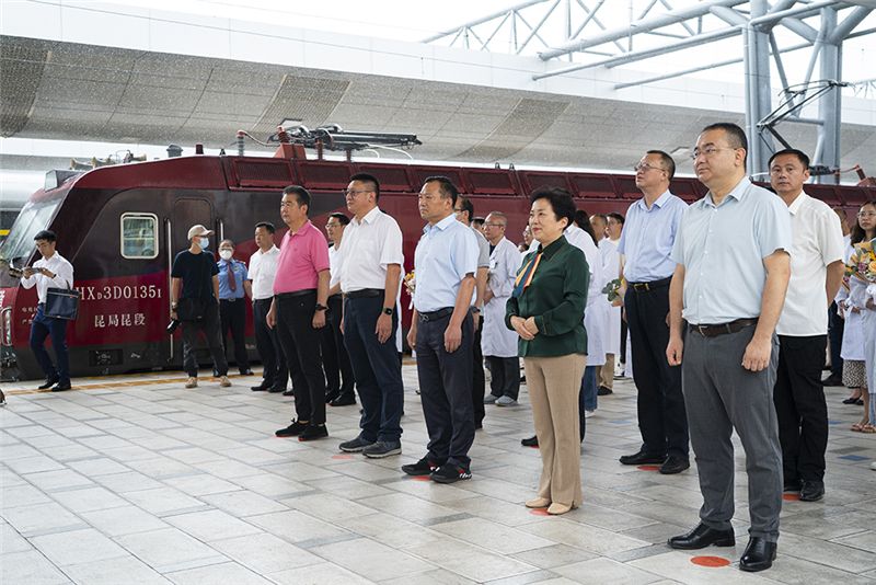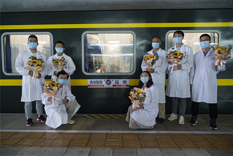 當(dāng)天,鐵路部門還為來(lái)自云南援滬和省內(nèi)抗疫一線的80名醫(yī)護(hù)工作者開辟綠色通道,免費(fèi)提供軟臥車廂,列車員一一為他們送上鮮花,誠(chéng)摯邀請(qǐng)抗疫英雄進(jìn)行列車巡禮,并在站臺(tái)上載歌載舞,以最高規(guī)格表達(dá)對(duì)他們的感激和敬意。