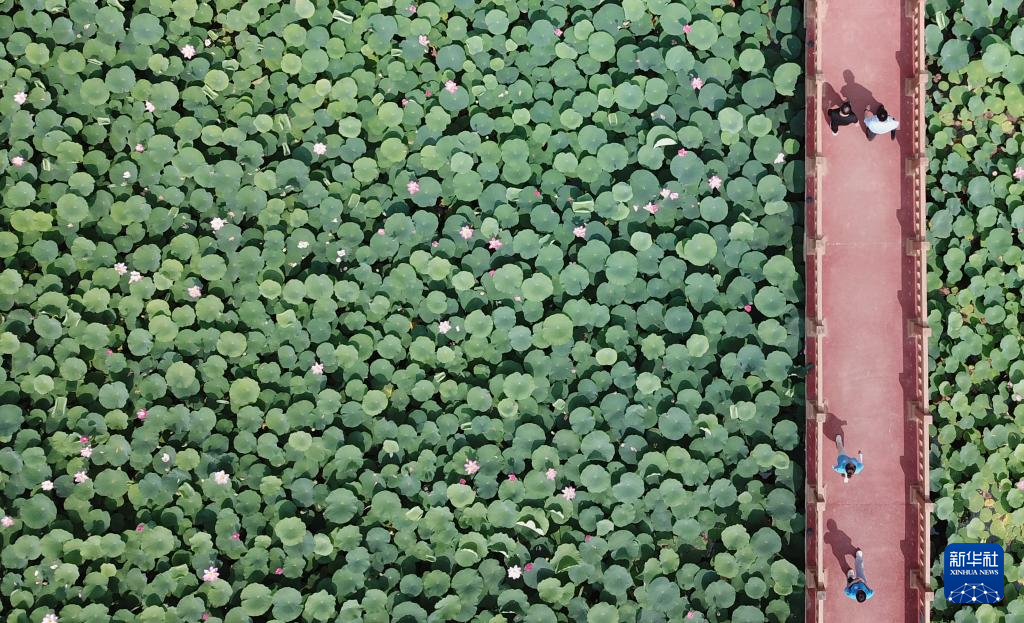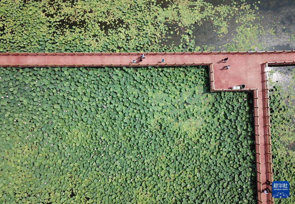 6月21日,在山東省曹縣黃河故道國(guó)家濕地公園,游客觀賞荷花(無(wú)人機(jī)照片)。