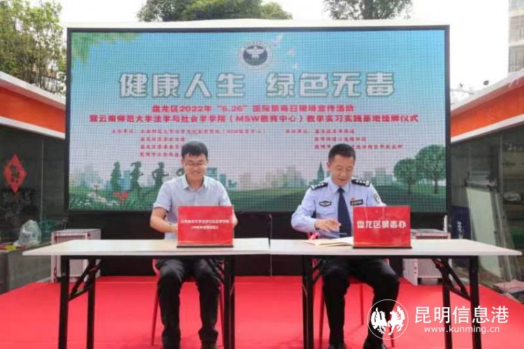 昆明信息港訊 記者合宇聰 6月24日,昆明市公安局盤龍分局組織開展以“健康人生、綠色無毒”為主題的禁毒現(xiàn)場宣傳活動暨云南師范大學(xué)法學(xué)與社會學(xué)學(xué)院(MSW教育中心)教學(xué)實(shí)習(xí)實(shí)踐基地掛牌儀式。